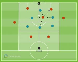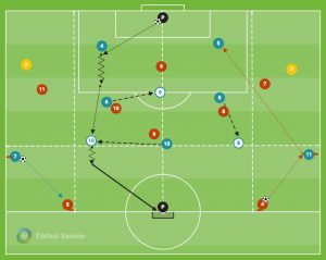 Aquí podemos ver un fundamento importante dentro del mecanismo de presión. Estamos hablando de la defensa del poseedor (jugadores de relación) y de la defensa del no poseedor (jugadores en vigilancia sobre posibles receptores). Aparecen conceptos como: triangula defensivo, orientación de la marca, posicionamiento básico defensivo, etc.