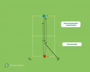 Como podemos ver hay 2 zonas. La primera nos sirve para habituar a jugador que defiende a reducir tiempo y espacio sobre el poseedor. La segunda zona nos ayudará a trabajar el posicionamiento de las piernas en la orientación del cuerpo y a escoger el momento adecuado de la entrada.