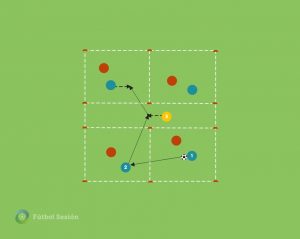 Es un ejemplo de ejercicio donde se ve con claridad que tipo de comportamiento tienen que tener los jugadores de relación (con participación directa) y el resto de jugadores. Aparecen conceptos clave como: Orientación de marca y de la presión, Posicionamiento básico defensivo, Reducción de espacio y tiempo cuando el balón de mueve, etc.