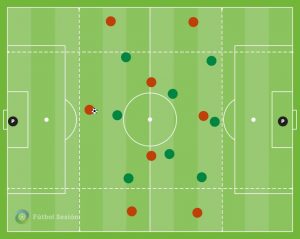 • Más de 2/3 pases en la mismo carril, sacar el balón de esa zona: El balón es un elemento que hace que el equipo rival se organice en relación a él. Eso provoca que si lateral y extremo, junto con algún jugador más realizan muchos pases en esa zona pueden provocar que se acumulen muchos jugadores para liberar a jugadores en otras zonas.