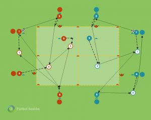 En este tipo de ejercicio de fútbol estaría en el límite entre toma de decisión condicionada o libre, dependiendo de la normativa que establezca el entrenador. El espacio de juego condiciona la velocidad en el juego, por eso pensamos que los fundamentos ofensivos que se dan son: Atraer para salir y el de direccionalidad de los pases.
