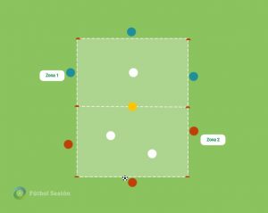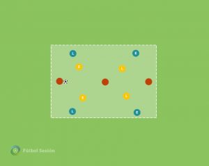 Dentro de un juego libre, o de una acción en estructura completa, delimitamos los espacios por fuera para resaltar que queremos focalizar las correcciones en ese espacio. Este sería el último pase para practicar y ver si lo que hemos trabajado con anterioridad tiene efecto inmediato en la competición.