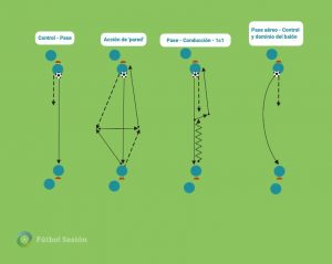• Acciones Técnicas Básicas: preparamos al cuerpo para poder realizar todo tipo de destrezas y acciones que nos podemos encontrar en un partido, pero de manera aislada. Estamos hablando de control, pase, conducción, regate, etc. Es la primera toma de contacto con el balón y es importante que el jugador vaya cogiendo buenas sensaciones con el mismo.