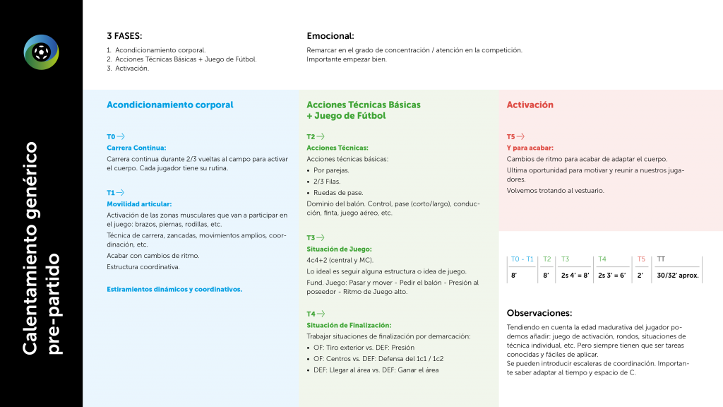 Darle la importancia que merece al calentamiento previo a un partido nos ayudará a prevenir lesiones, a establecer el contexto emocional adecuado para que el equipo compita mejor y a obtener lo mejor de cada jugador. Aunque el calentamiento es un acto colectivo, no debemos olvidar la individualidad, respetando aquello que permitirá que cada jugador encuentre sus mejores sensaciones para afrontar de manera óptima la competición.